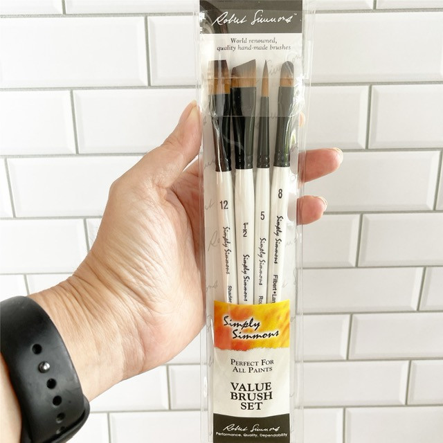 - Set consists of Filbert 8, Round 5, Angled 1/2", Shader 12