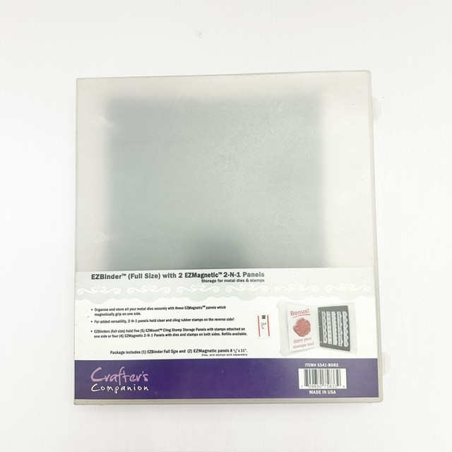 EZBinders (Full Size) hold five (5) EZMount cling Stamp Storage Panels (SS05) with stamps attached on one side or four (4) EZMagnetic 2-N-1 Panels (SS41-2) with dies and stamps on both sides or twelve (12) EZMagnetic 2-N-1 Panels (SS41-2) with dies on one side and nothing on the back sides.