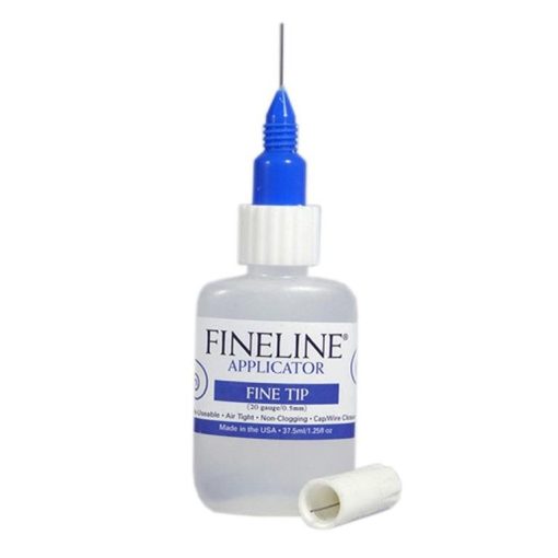 FINELINE APPLICATORS-Applicator Bottles. These empty applicator bottles feature a stainless steel dispensing tip for precise application of a variety of liquid media and the unique Cap/Wire system is non-clogging and air-tight! Use with acrylics, ink, gutta, watercolors, oil paints, silk dyes, stains, henna, water-based glues, glazes, and more (all sold separately). This package contains two 1.25 fl-oz (37.5 ml) bottles each with a 20 gauge (.5mm) tip. Made in USA.