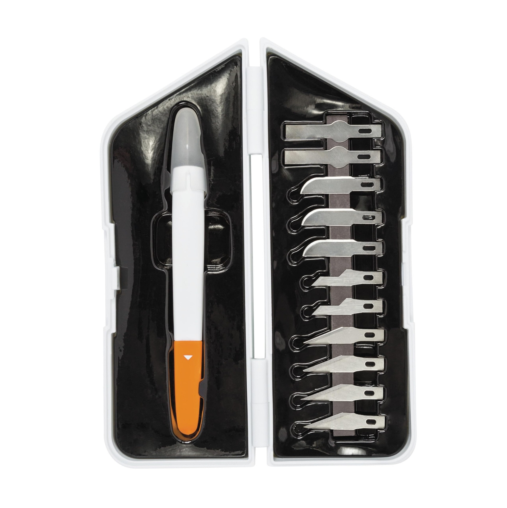 - Contents: 1x Fiskars Premium precision handicraft knife set, Included 12 blades, Dimensions: 2.4 x 21 x 14.5 cm (HxLxW), Weight: 230 g, Material: Steel/Plastic, Colour: white/orange, 1024384