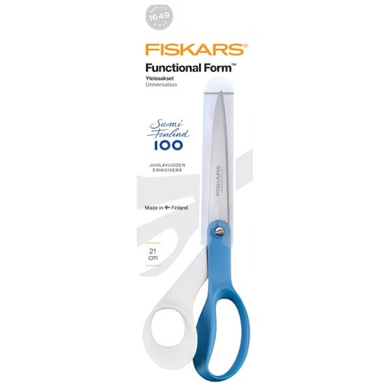 FISKARS FUNKTIONAL FORM FINLAND FINLAND 100. In honor of the celebration, Fiskars has designed Scissors for the Functional Form series. Fiskars' traditional overtones have received blue-white color in accordance with Finland 100. The Saxophone has 100 engraving in Finland and a limited batch is available.