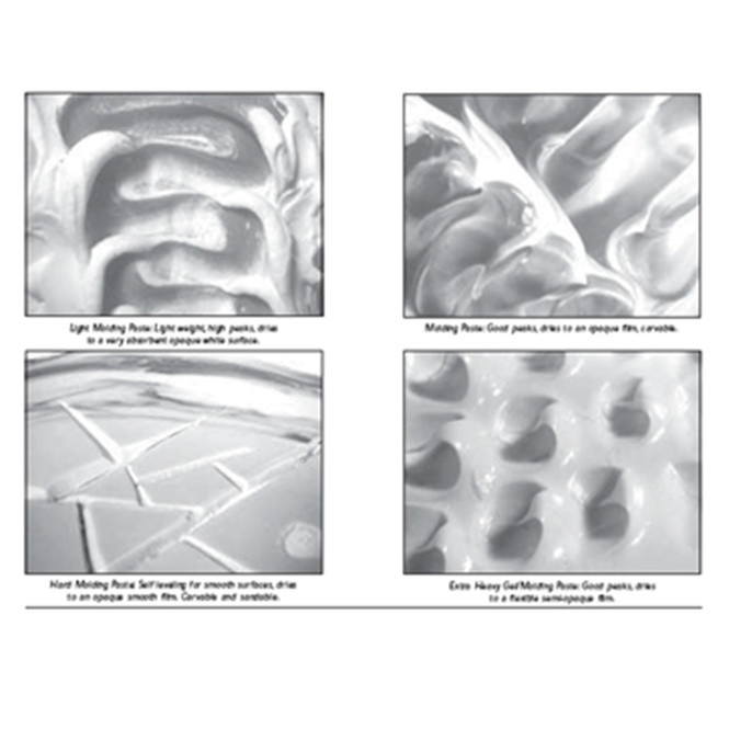- Hard Molding Paste: Dries to a very hard, opaque grey finish that can be sanded, carved, or sculpted with power tools.