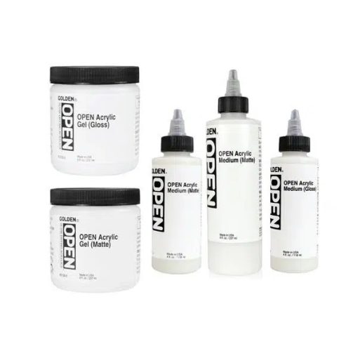 OPEN acrylic medium helps maximize the working time of Golden OPEN Slow Dry Acrylics and can be used to adjust color intensity and translucency while maintaining consistency. OPEN Matte Acrylic Medium will reduce the viscosity of the paint to create a smoother mix and increase flow. OPEN fluid mediums are also useful for reducing the viscosity of Heavy Body colors and slowing down drying for painting details with fine brushes.