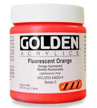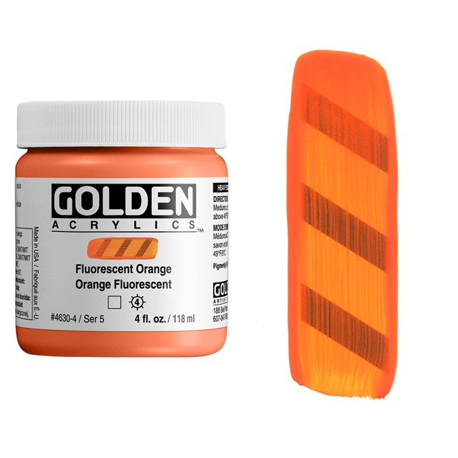 Fluorescent Acrylic Colors are intense, brilliant colors, produced from dyes surrounded by a polymer coating. Because fluorescent colors are transparent, greater intensity is achieved by applying them over bright white surfaces. Fluorescent Colors are not lightfast. For permanency, a topcoat of GOLDEN MSA Varnish with UVLS (UltraViolet Light Stabilizers) is recommended, although varnish and top coats will eliminate the fluorescent "glow" under black light.