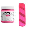 Fluorescent Acrylic Colors are intense, brilliant colors, produced from dyes surrounded by a polymer coating. Because fluorescent colors are transparent, greater intensity is achieved by applying them over bright white surfaces. Fluorescent Colors are not lightfast. For permanency, a topcoat of GOLDEN MSA Varnish with UVLS (UltraViolet Light Stabilizers) is recommended, although varnish and top coats will eliminate the fluorescent "glow" under black light.