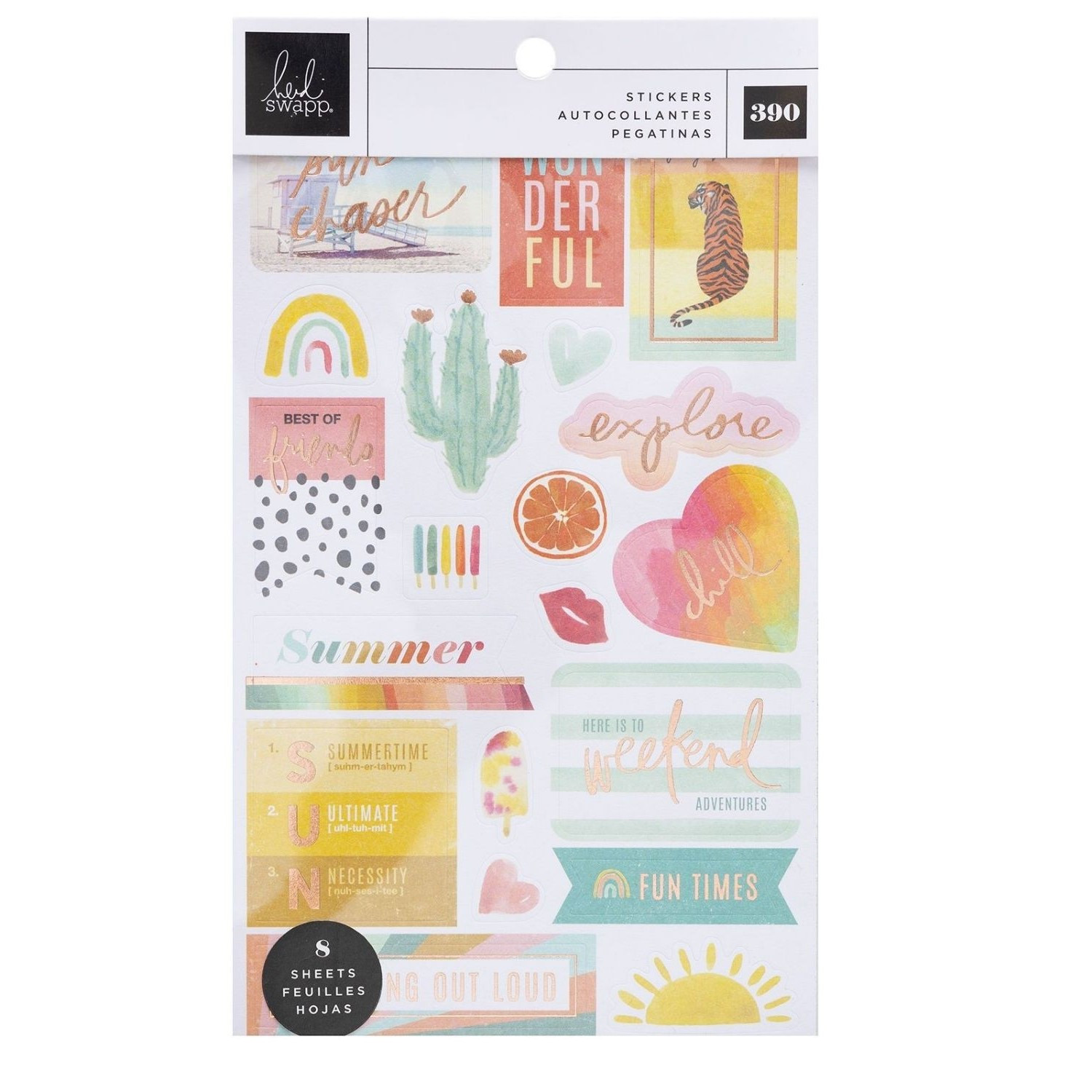 Stickers add the perfect finishing touch to your paper projects. Stickers can be a fun embellishment, a whimsical accent or add elegant polish to scrapbook pages, greeting cards, mixed media and more. This package contains Heidi Swapp Sun Chaser Sticker Book with Rose Gold Foil, 390 pieces. Imported.