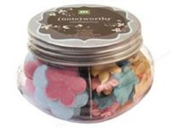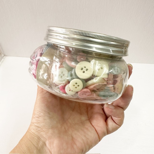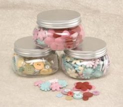 - Buttons, paper flowers & embossed felt flowers packaged in a cute reusable plastic jar.