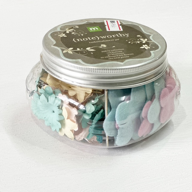 Our Embellishment Jar Sets are proof that good things do indeed come in threes. Choose from 3 color families, each with 3 different types of product divided into 3 separate sections. Buttons, paper flowers & embossed felt flowers packaged in a cute reusable plastic jar. Coordinates with the entire Noteworthy™ collection. Each package contains 100 buttons, 40 blossoms and 20 felt flowers