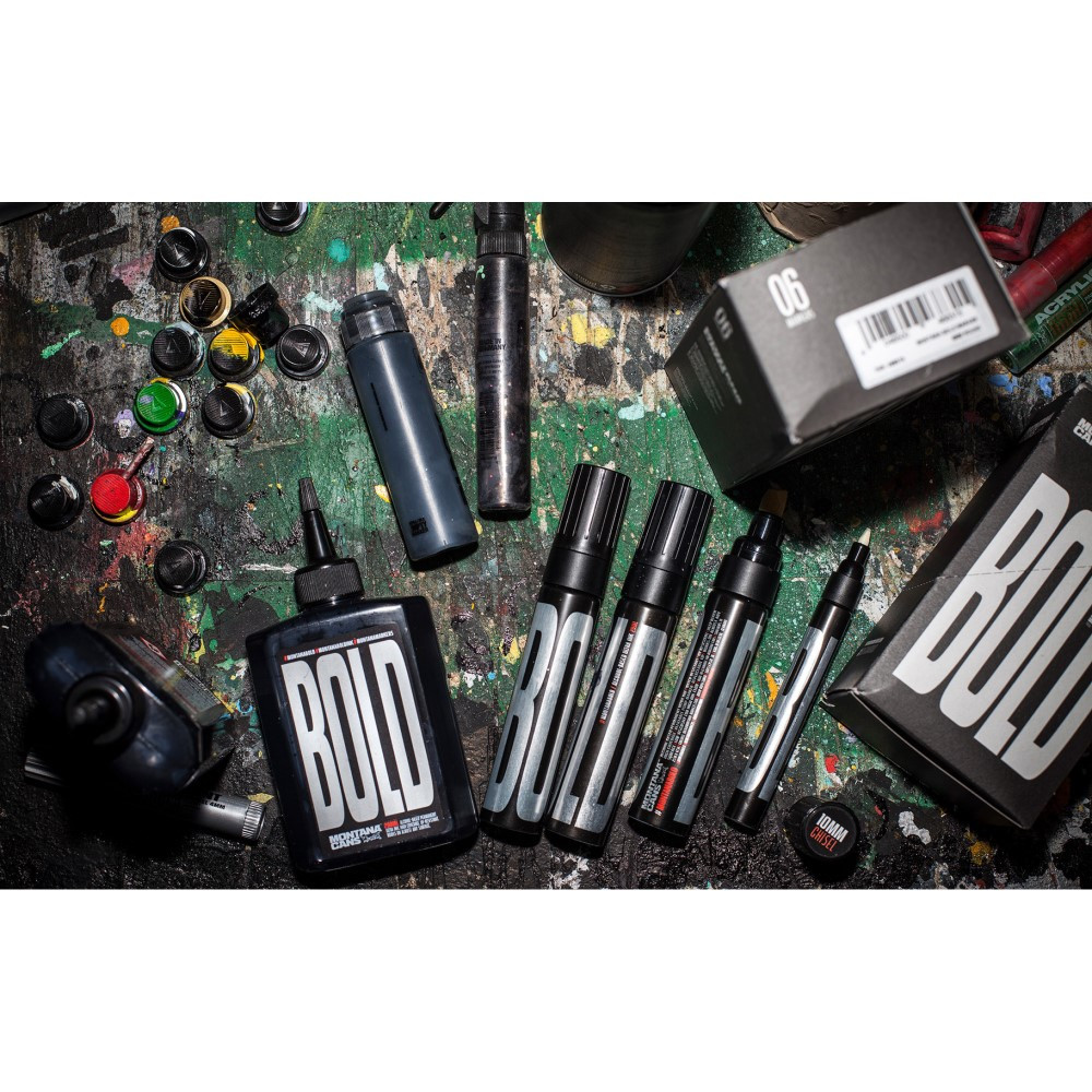 Also available on the Montana BOLD Line are the 8mm Round tip, a 10mm Chisel tip, 15mm Standard Marker as well as a thinner 3mm Chisel tip Marker. Montana The BOLD ULTRA INK Refill 200ml is the perfect match to this series of Markers. Montana BOLD – a classic high quality Montana Marker containing highest quality Ink, all made in Germany.