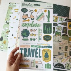 This kit contains 6 sheets of double sided paper measuring 12 inches x 12 inches and one 6×12 inch coordinating sticker sheet. The papers are about 180gsm and are travel themed, perfect for summer travels documenting.