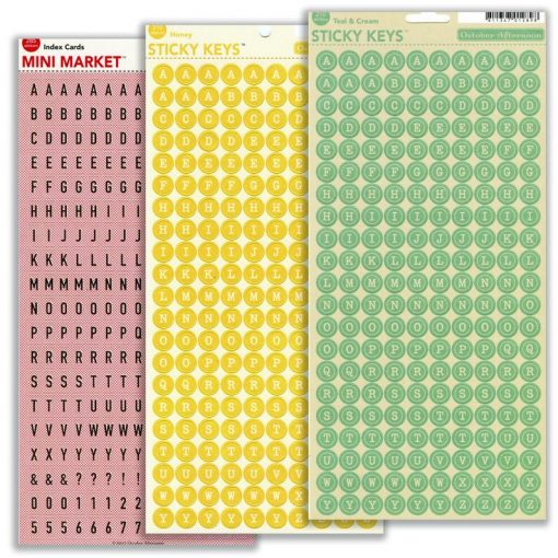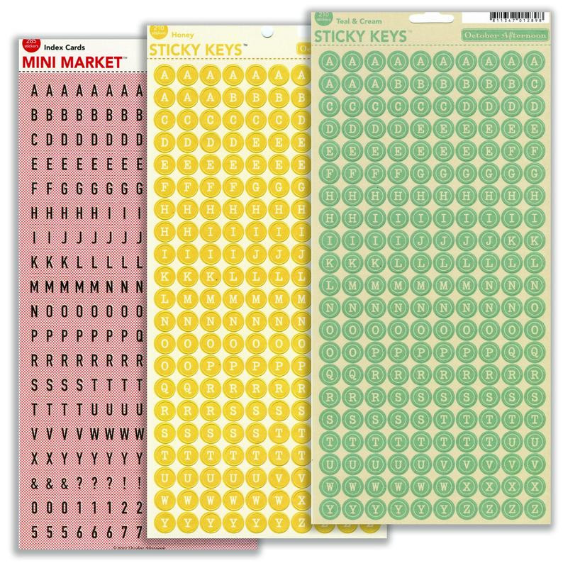 October Afternoon Letter Stickers. Two are "Sticky Keys" and the other is "Mini Market". They are printed on cardstock with an adhesive back.