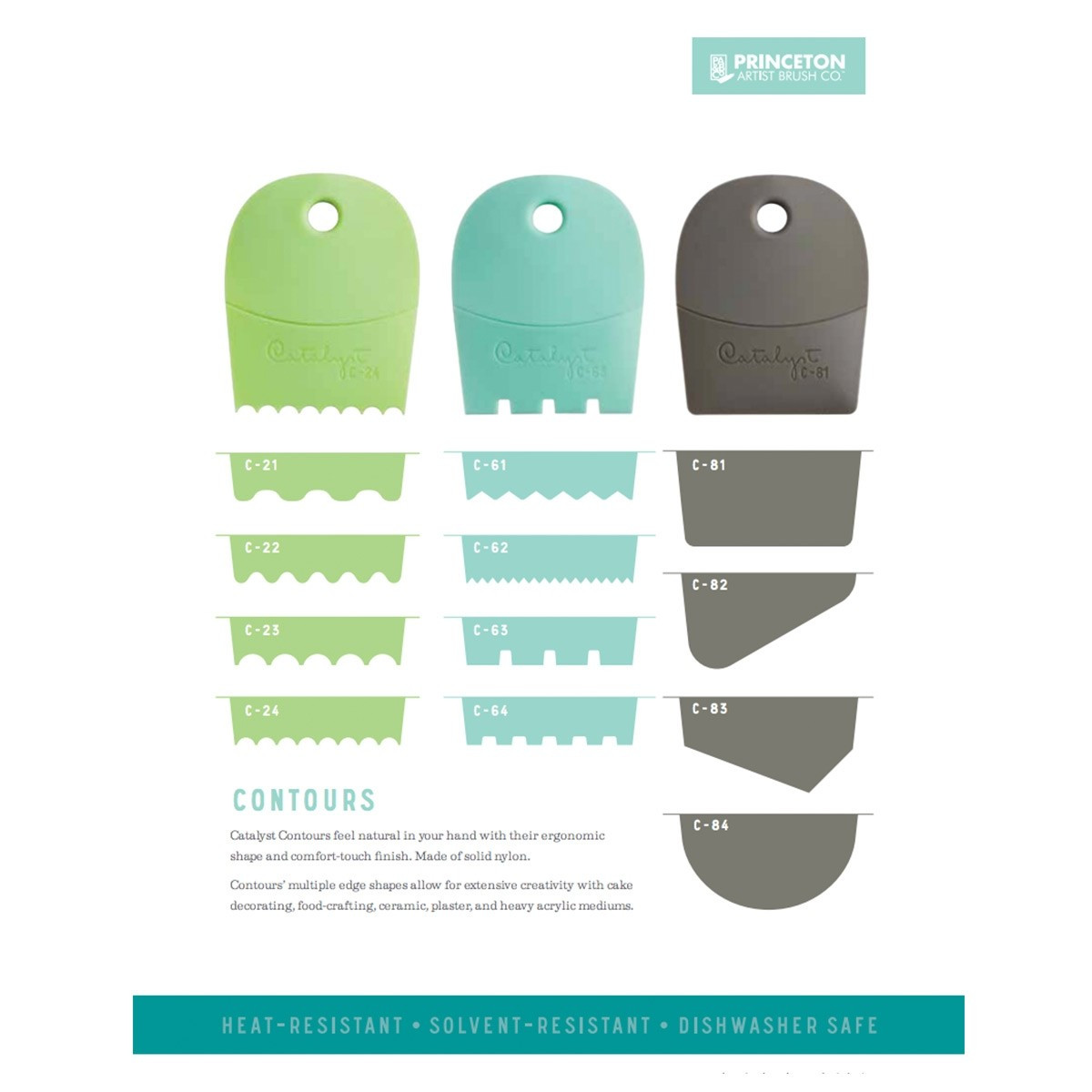 Catalyst Contours are a great new way to shape acrylic and oil paints as well as different mediums such as ceramic plaster and are even FDA approved to use for cake decorating and food crafting! Made out of heat-resistant solid nylon, they excel with encaustics. Their ergonomic design fits comfortably in your hand to make any sculpting, shaping or texturing even easier. And clean up is a breeze with the Contours; most messes come off with soap and water. Dried paint can be peeled off and the Contours are even dishwasher safe. Then when you're done using them, just hang them up with their handy hanging holes.