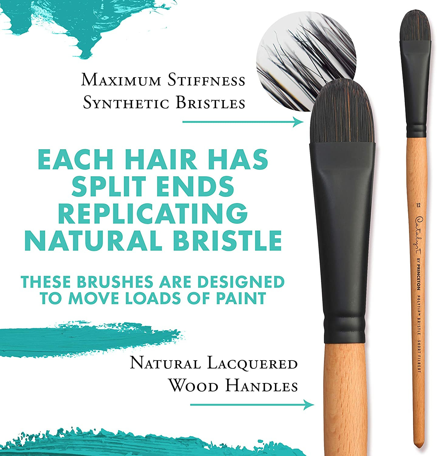 Catalyst™ Polytip Bristle brushes are another Princeton breakthrough that advances the science of synthetic hair. This new series is super stiff yet still extremely responsive. Unlike natural hog bristle, Catalyst™ has real integrity in water. Natural bristle can be rendered useless when it is water-soaked. The true advance in Catalyst™ is the Polytip feature. For the first time, the tip of each individual hair has been split to replicate the natural flags on the finest natural bristle. By giving each individual hair 2 to 3 distinct tips, Catalyst™ is able to hold a higher volume of paint while providing a smoother application. Designed for use with medium to heavy-bodied acrylics and oil paints, Catalyst™ pushes even heavy gel media with assurance. Catalyst™ Polytip Bristle brushes truly are tools that move paint.