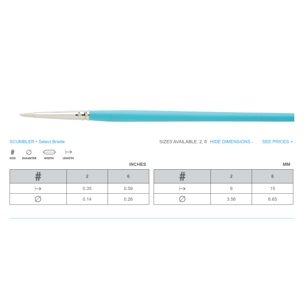 The Princeton Select Artiste Scumbler (often referred to as a scumbler or round blender) is a specialized, short-handled, multi-media brush designed for creating soft textures, blending, and special effects in acrylic, oil, and watercolor painting. Part of the 3750 Series, these brushes are recognized by their distinct satin-finish, jewel-tone blue handles and nickel-plated brass ferrules.