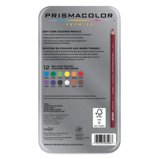 - Package contains twelve pencils in a storage tin (Prismacolor numbers PC903, PC909, PC912, PC916, PC918, PC924, PC932, PC933, PC935, PC938, PC945 and PC946)