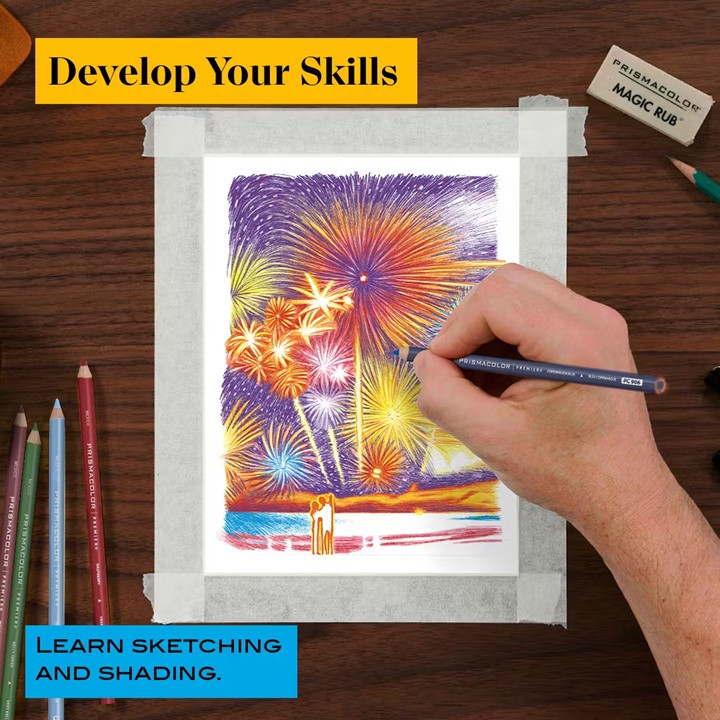 Learn how to draw a brilliant fireworks display exploding off the page with the Prismacolor Technique Fireworks Drawing Set! This pack of artist-quality colored pencils comes with a QR code for step-by-step instructions—perfect for every level of artistic expertise! The high-quality pigments of Prismacolor colored pencils provide rich color saturation, while the soft, thick cores create a smooth color laydown for excellent blending and shading. This art set will help you get the most out of your Prismacolor art supplies—to create the fireworks art lesson and a variety of drawings afterwards!