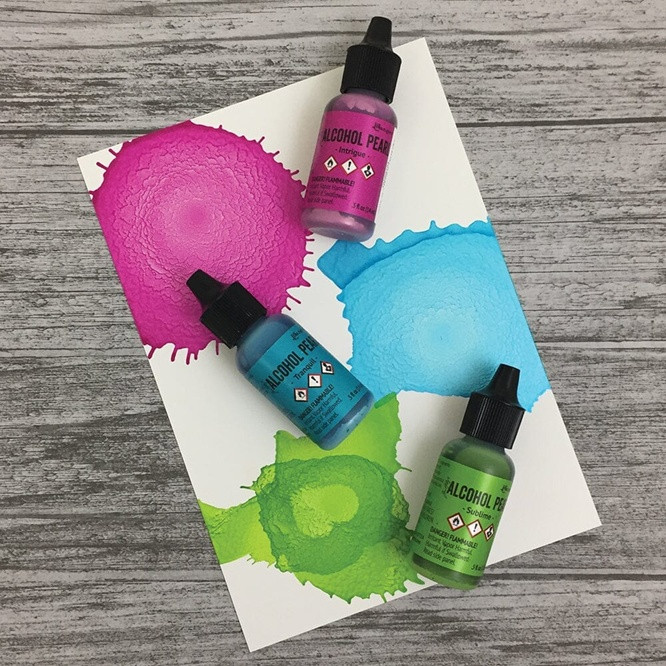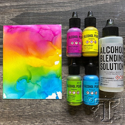 Ranger Ink Tim Holtz Alcohol Pearls are permanent, fast-drying, pigment-and-dye inks designed to create a pearlescent, shimmer effect on non-porous surfaces like Yupo paper, foil, glass, and metal. Unlike Mixatives, these pearls combine color with shimmer for an all-over pearlescent look, best used with blending solutions.
