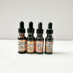 Tim Holtz Distress Reinkers are 0.5 oz. amber glass bottles with droppers, designed by Ranger to refresh Distress Ink pads, ensuring a long life for crafting tools. These acid-free, non-toxic, water-based (dye/pigment) inks are perfect for watercoloring, blending, stamping, and creating aged, vintage effects on paper crafts.