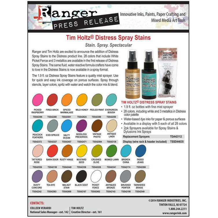 Tim Holtz Distress Spray Stains are water-reactive, dye-based sprays designed for quick, vibrant coverage on porous surfaces like paper, wood, and tags. They offer a matte finish and are ideal for layering, blending, and creating backgrounds in mixed-media projects. Available in 76+ colors, they do not require shaking, unlike mica sprays.
