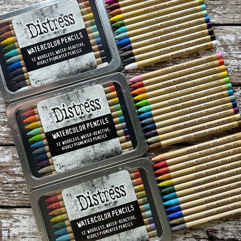 The world of Distress just got even more colorful with the introduction of new Distress Watercolor Pencils. These woodless watercolor pencils are formulated to achieve vibrant color effects on porous surfaces. The solid water-reactive pigments are ideal for coloring directly on your surface, shading, sketching, or blend with water for watercolor, stamping and more. Designed to color over Distress Ink, Oxide, Paint, Collage Medium and more, the new Distress Watercolor Pencils provide a whole new way to Distress! Available in 6 sets of 12 colors each