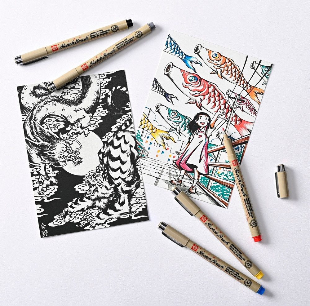 Pigma Sketch Brush is a semi-firm brush tip that adapts to pen pressure, offering smooth transitions between thick and thin lines with firm control for consistent, detailed strokes. Ideal for lettering, calligraphy, journaling, drawing and sketching.