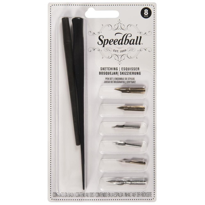 - SPEEDBALL-Sketching Set. Calligraphy pen and nib set designed for Drawing, Cross-hatching, Lithography, and Fine Details. Contains: two black plastic pen holder, and nibs: 99, 56, 102, 107, 108, and 512. Made in USA.
