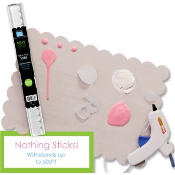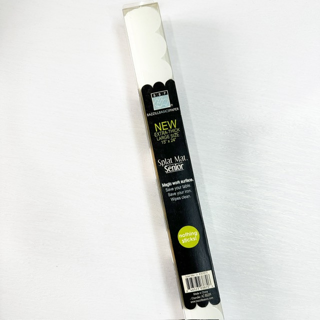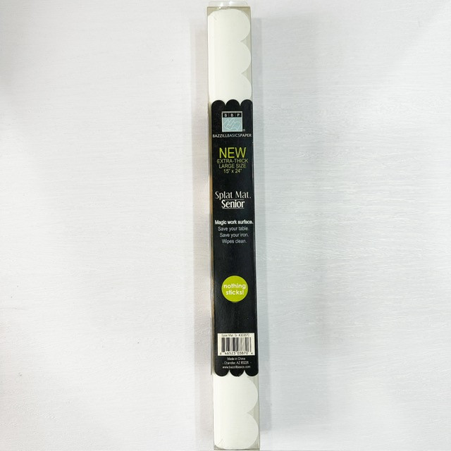 Once you try it, you'll wonder how you ever crafted without the White Splat Mat Senior by Bazzill Basics! This sturdy 24" x 15" mat is ideal for every type of messy crafting and will protect your dining tables, work benches, crafting areas, home offices, and more. Nothing sticks to it, including glue, paint, ink, wax, glitter, soap, or starch! Simply let the material dry and peel it right off the mat. The Splat Mat resists the heat of a wood-burning tool, hot wax, and a soldering iron. It has a scalloped edge and rolls up for convenient storage.
