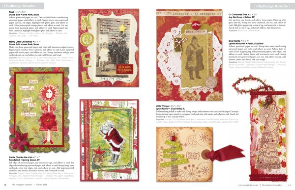 This year we received so many holiday submissions that we decided to dedicate the bulk of this astounding issue to the festivities of the season —the gorgeous stamped projects in this issue are sure to kick your holiday spirit into high gear! The results of our Goddess Template Challenge truly left us stunned, and keep an eye out for our Guest Artist, Laurie Davis, whose cards are so pretty they will make your heart sing. Don’t miss the drool-worthy techniques, such as a unique way to incorporate rolled paper flowers into your stamped projects inside these new feature articles.