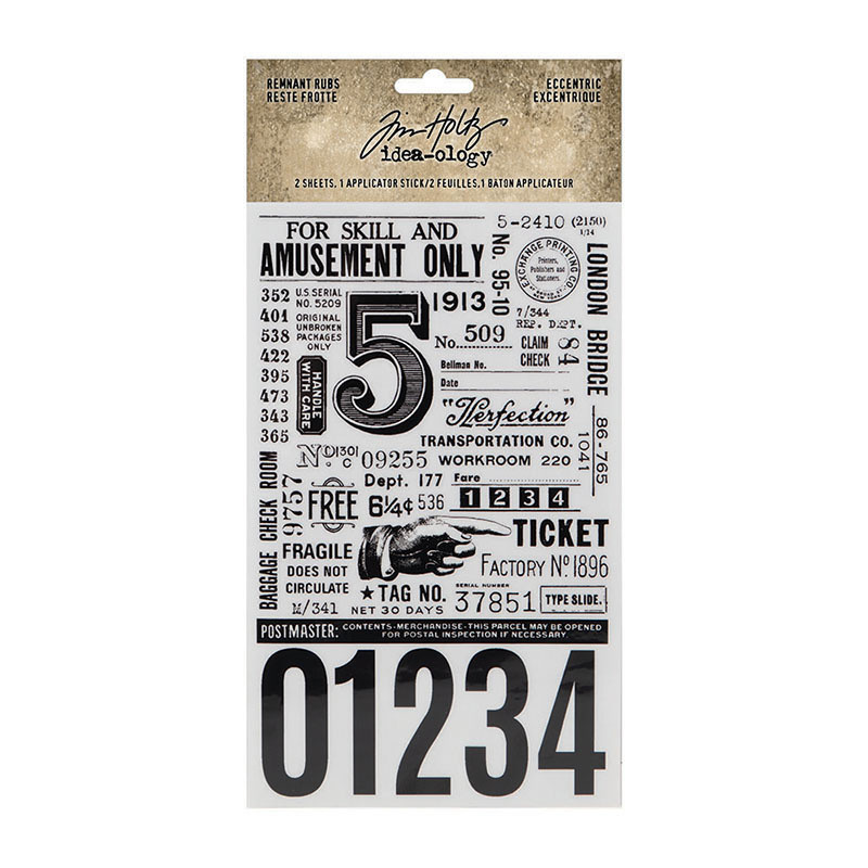 Tim Holtz Remnant Rubs Eccentric is a large array of imagery that are easy to rub-on your next craft make. The Remnant Rubs include two different sheets of numbers, words, and other elements for journaling, cards, and more.Remnant Rubs are pressure sensitive transfers that can be applied to various surfaces. Constructed of adhesive-backed paper. This package contains Tim Holtz Idea-Ology Remnant Rubs Rub-Ons 4.75×7.75 inches, 2 sheets, 1 applicator stick. Imported.