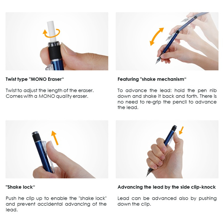 Mechanical pencil featuring "MONO Eraser" and "shake-mechanism."