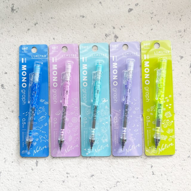 Mechanical pencil featuring "MONO Eraser" and "shake-mechanism."