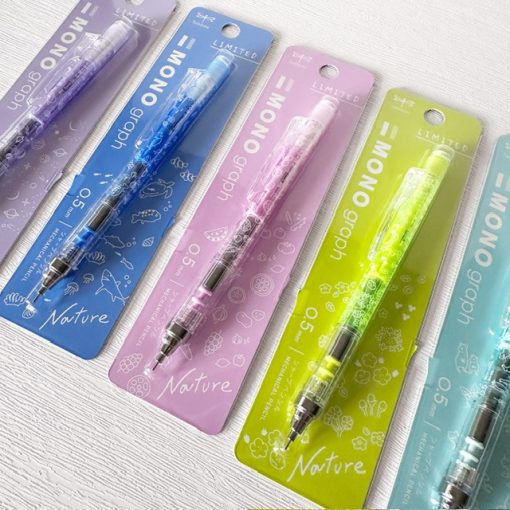 Mechanical pencil featuring "MONO Eraser" and "shake-mechanism."