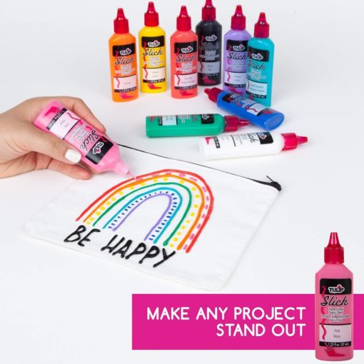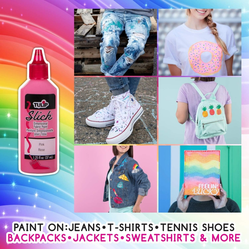 Tulip Dimensional Fabric Paints are formulated exclusively for fabrics, drying with a dimensional, ultra-flexible bond so they won't crack or peel with movement. These nontoxic fabric paints dry permanently with a shiny finish that works on fabric and other surfaces. Turn your fabrics into works of art with these easy-to-use paints! This 9.6×1.16×11.1 inch package contains ten dimensional fabric paints in assorted rainbow colors. Imported.