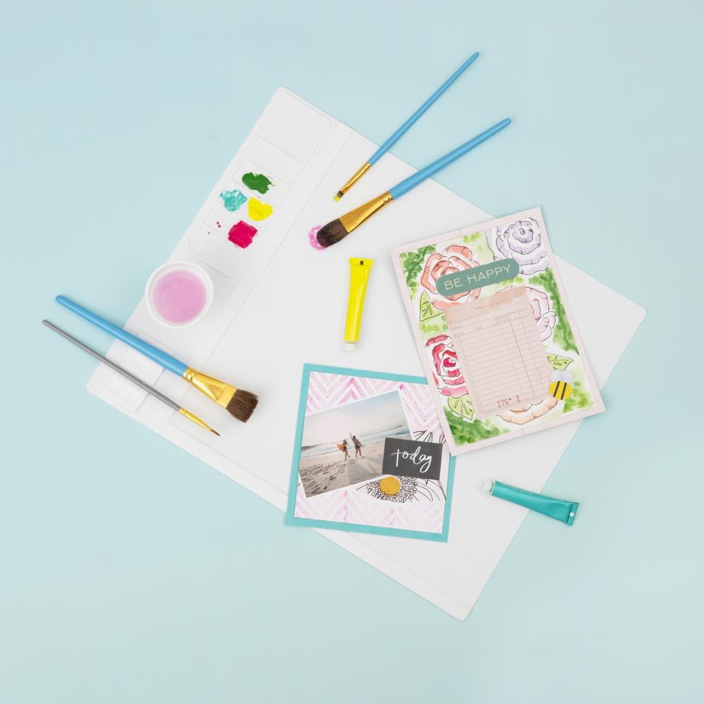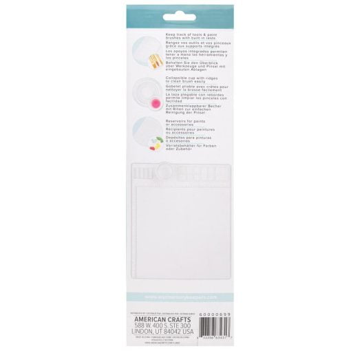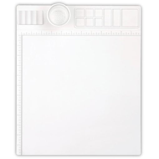 Non-stick, waterproof, and heat-resistant multi-function craft mat. Recessed work area measuring approximately 12×12 inches. Features built in brush holders, a collapsible water cup with cleaning ridges, and multiple sized reservoirs. Perfect for painting, clay modeling, epoxy resin projects, and more! Imported.