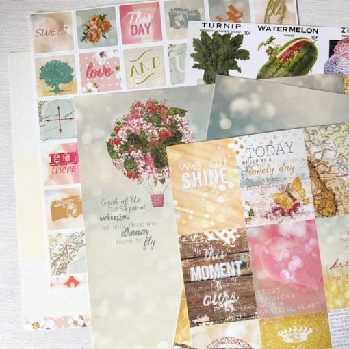 This listing is for six sheets of 12 inch x 12 inch cardstock by Websters Pages. The theme is Strawberry Fields, and like all Webster's Pages cardstock they are approximately 190-200gsm. The cardstocks are double sided and printed in USA. they are archival quality and suitable for albums, scrapbooks, cards and journals. They can also be used in many creative paper crafts.