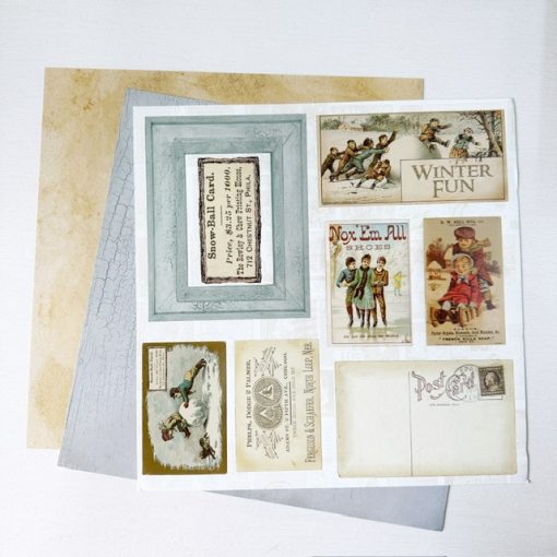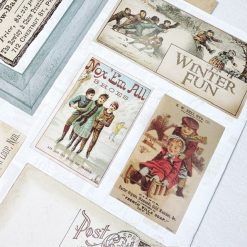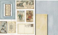 In each kit, there are two sheets of single side patterned papers, and 1 sheet containing 1 frame, 1 title, and antique cards and postcards. Use these antique images for your journals or scrapbooks. You can layer or distress them further. They are archival quality and imported from USA.